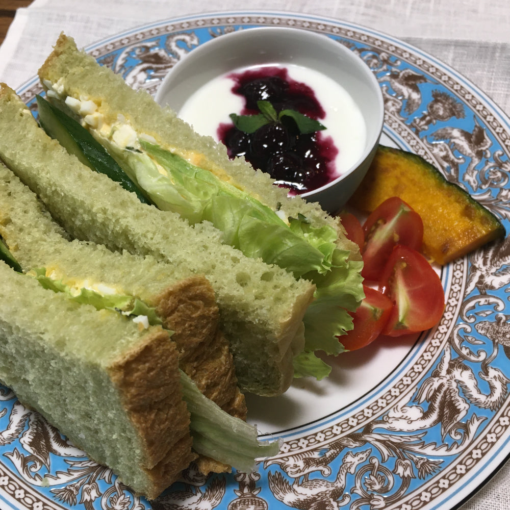 青汁を食パンに混ぜ込むというアイデアが斬新なレシピです。ジュースに変えれば手軽にアレンジが楽しめると思います。紫の野菜ジュースで作って、そのパンでフルーツサンドとか作っても良さそうと勝手に想像してしまいました。具材に入っているクリームチーズがアクセントになっていてよかったです。サーモンやキャロットラペなどを入れても色が増えて良いですね。