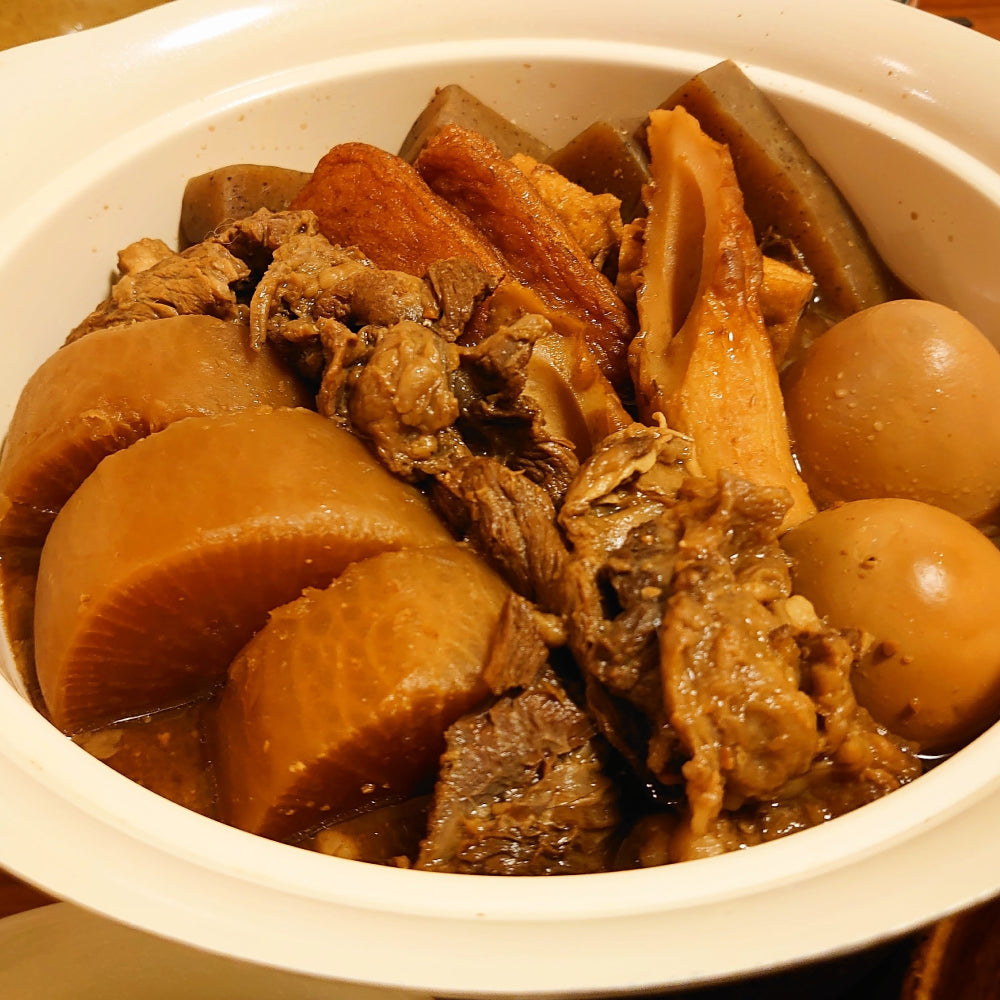 おでんは具材が多くて下準備に時間がかかる印象ですが、下ゆでが必要な牛すじも、電気圧力鍋を活用することで、手間が少なく、またスロー調理でじっくり煮込むことでほったらかしでも味がしみ込むのが嬉しいポイントだと思います。ごはんがすすむ味付けなのもいいですね。