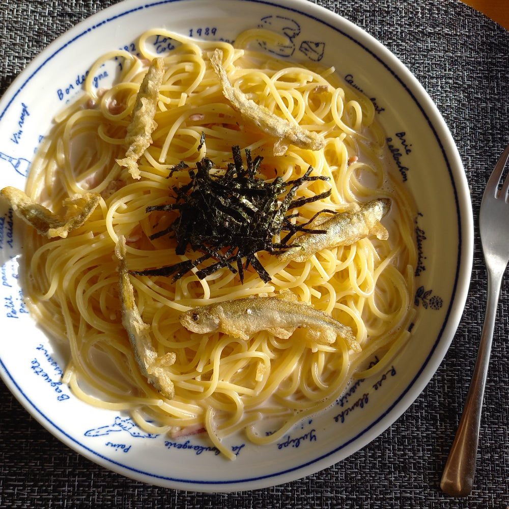 クリームパスタとわかさぎの組み合わせが新しい!塩辛を使うレシピは珍しく、良い意味でくせがあって、お酒にも合いそうに思います。材料も少なく、作り方も簡単で、失敗知らずでおいしく作れるレシピでした。ケトルのみで作れるレシピということで、包丁も使わず洗い物も少なくて良い。海苔に加えてトッピングに大葉などグリーンを添えてみてもいいですね。