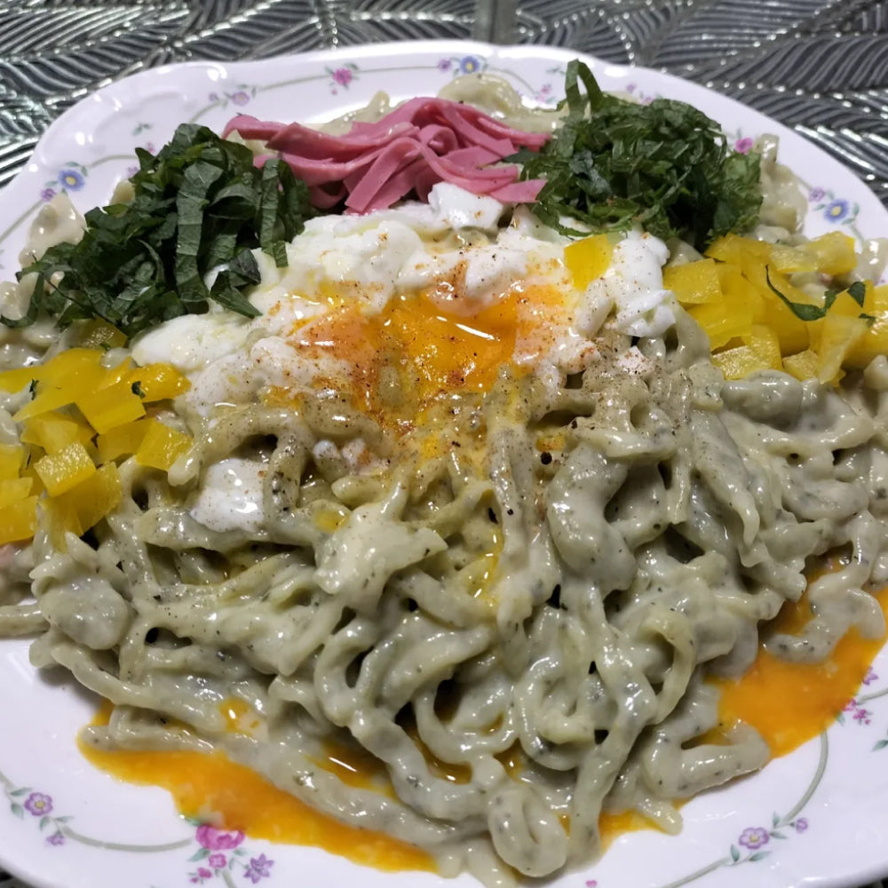 うどんのアレンジとしてとても面白いレシピ!うどんに野菜を練り込むアイディアは斬新。手作りのうどんは手間がかかるので、ちょっとハードルが高いですが、出来立てのもちもち感を楽しめるレシピですね。ほうれん草とカルボナーラの卵の風味が合っていて美味しかったです。