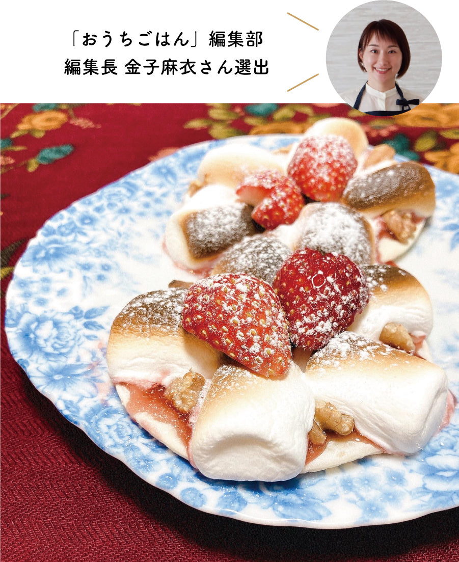 特別な道具もコツも必要なく手作りでスイーツが作れるレシピで自分でも作ってみたいなと思いました。いい感じに焼き色がついたマシュマロと真っ赤な苺が食欲をそそります。甘酸っぱいいちごジャムとこんがり焼いた甘~いマシュマロがたまりません!!食感が楽しいくるみのトッピングや、シュガーパウダーの仕上げも◎。調理は手軽なのに、全体的にとても仕上がりが高くて素晴らしいです。